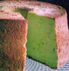 2. Aduk rata kuning telur dan gula pasir, masukkan minyak selada, santan dan tepung terigu, baking powder dan soda kue, aduk hingga menjadi adonan yang kental. Tambahkan pasta pandan aduk rata.